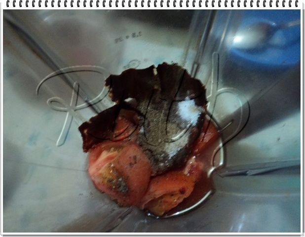Mientras se fríe, en la licuadora se coloca el tomate, el chile guajillo, los condimentos y agua al gusto, debe quedar solo un poco caldosa